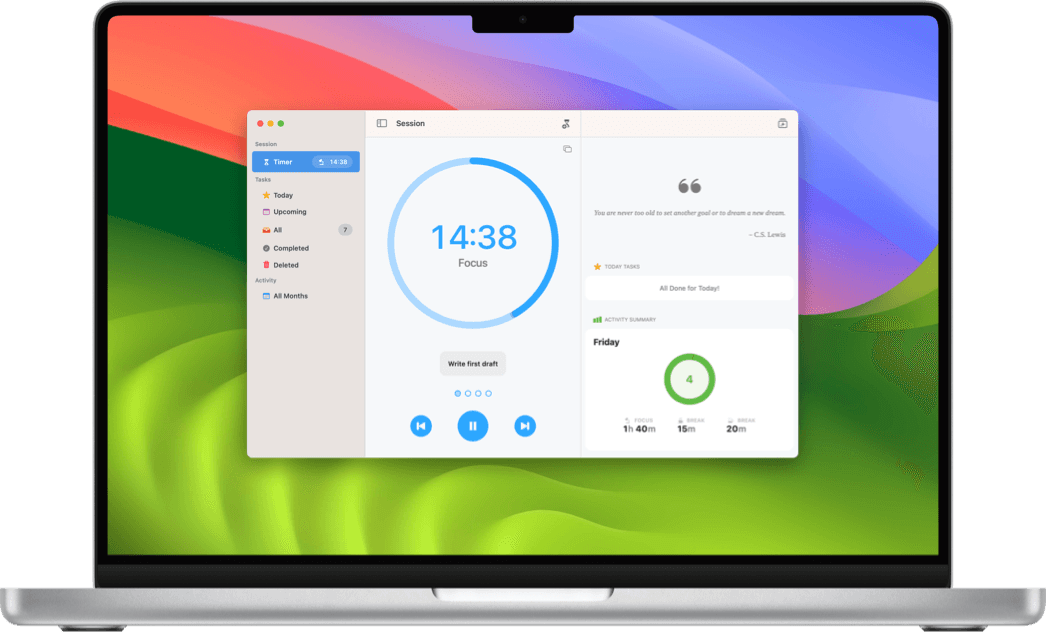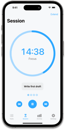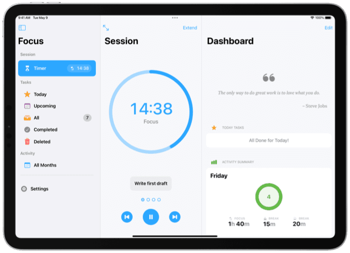 You can adapt the timer to fit your workflow and get reminders to take regular breaks. Set a personal daily Focus Session goal to stay motivated and get some focused work done each day.