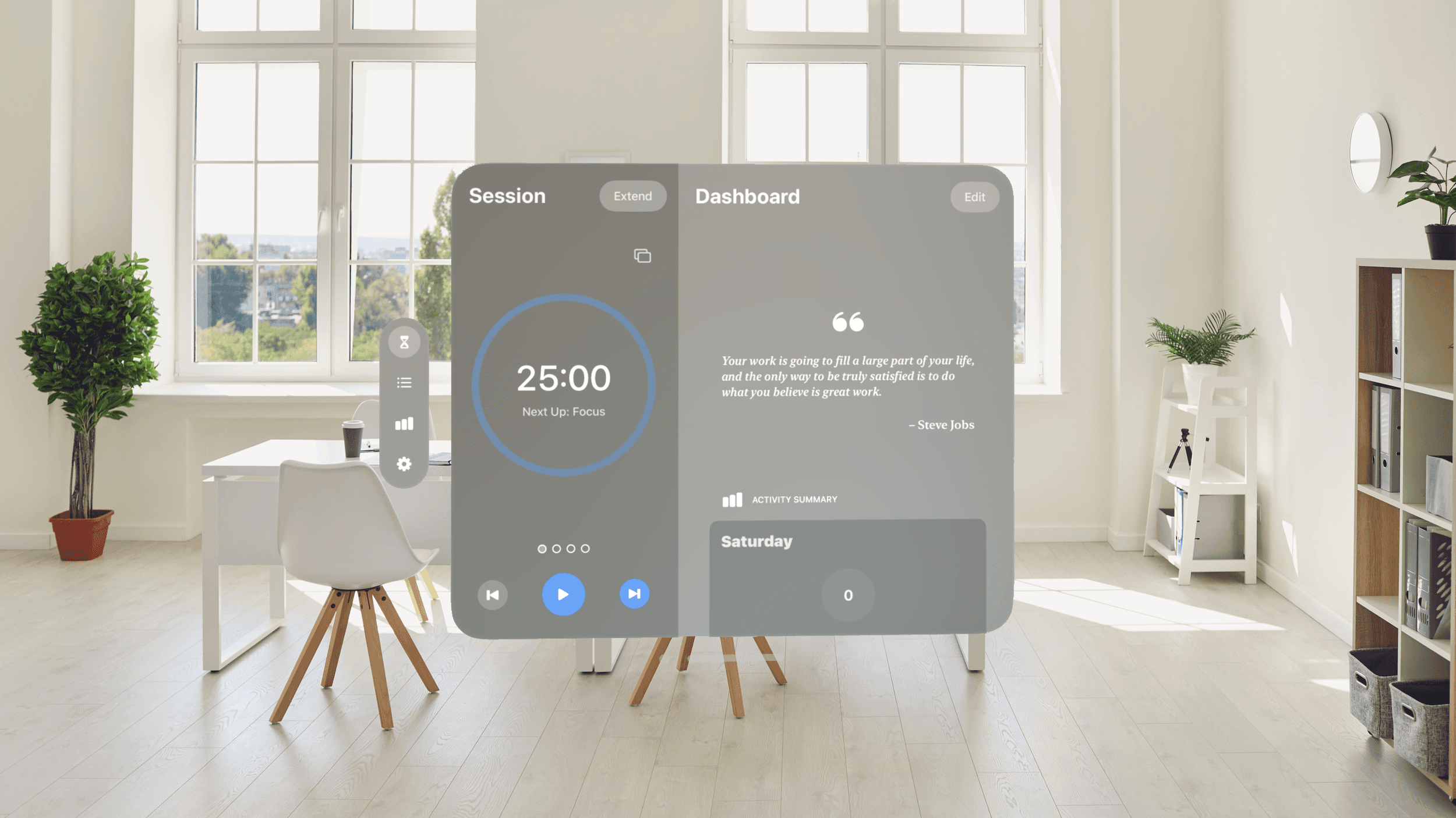 Focus is also available natively for Apple Vision Pro. It seamlessly integrates with the new design language of Vision Pro and lets you pop out a mini timer that you can place next to other windows while you work. It’s a useful companion for productivity on Apple Vision Pro!