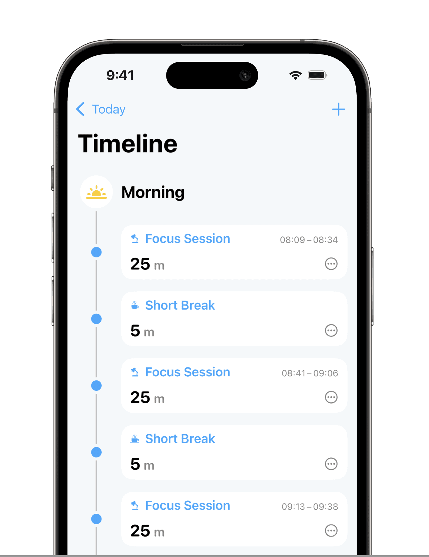 The timeline allows you to edit your data: add a Focus session manually or change the logged task for a session, so that your data always accurately reflects the actual work you've put in.