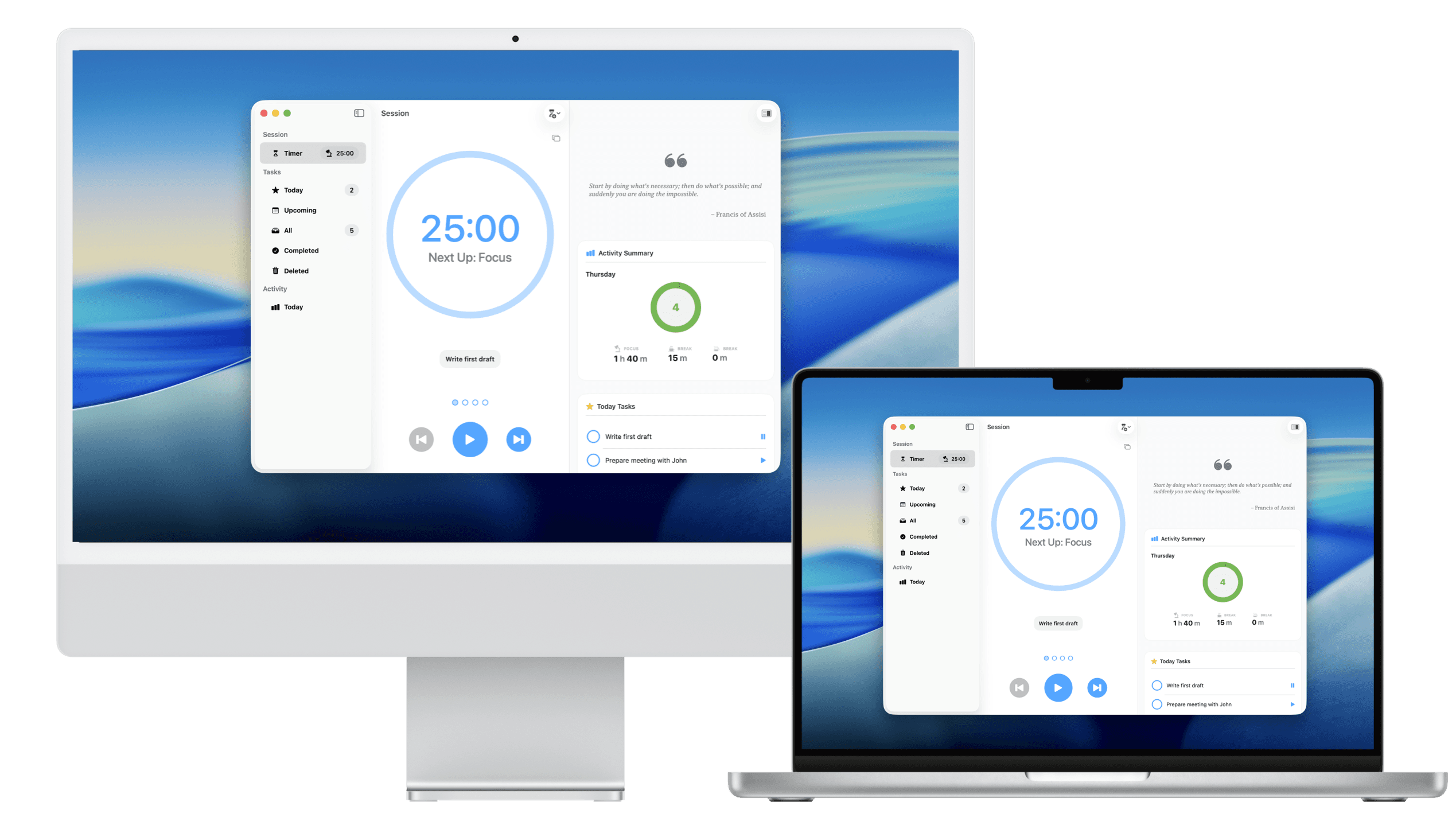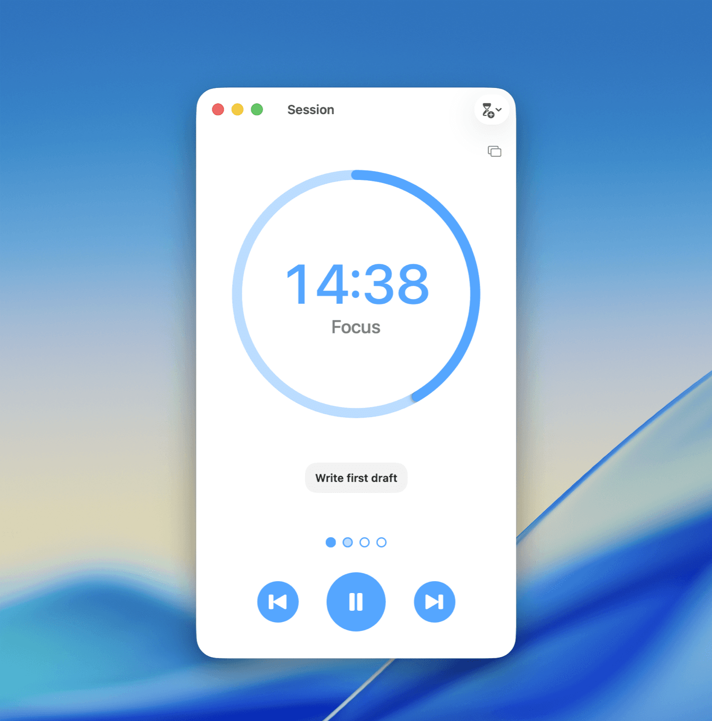 Focus breaks your work into sessions – short sprints of focused work – making it easier to stay concentrated without distractions. Regular breaks between sessions reduce stress, support your well-being, and keep you sharp and focused.