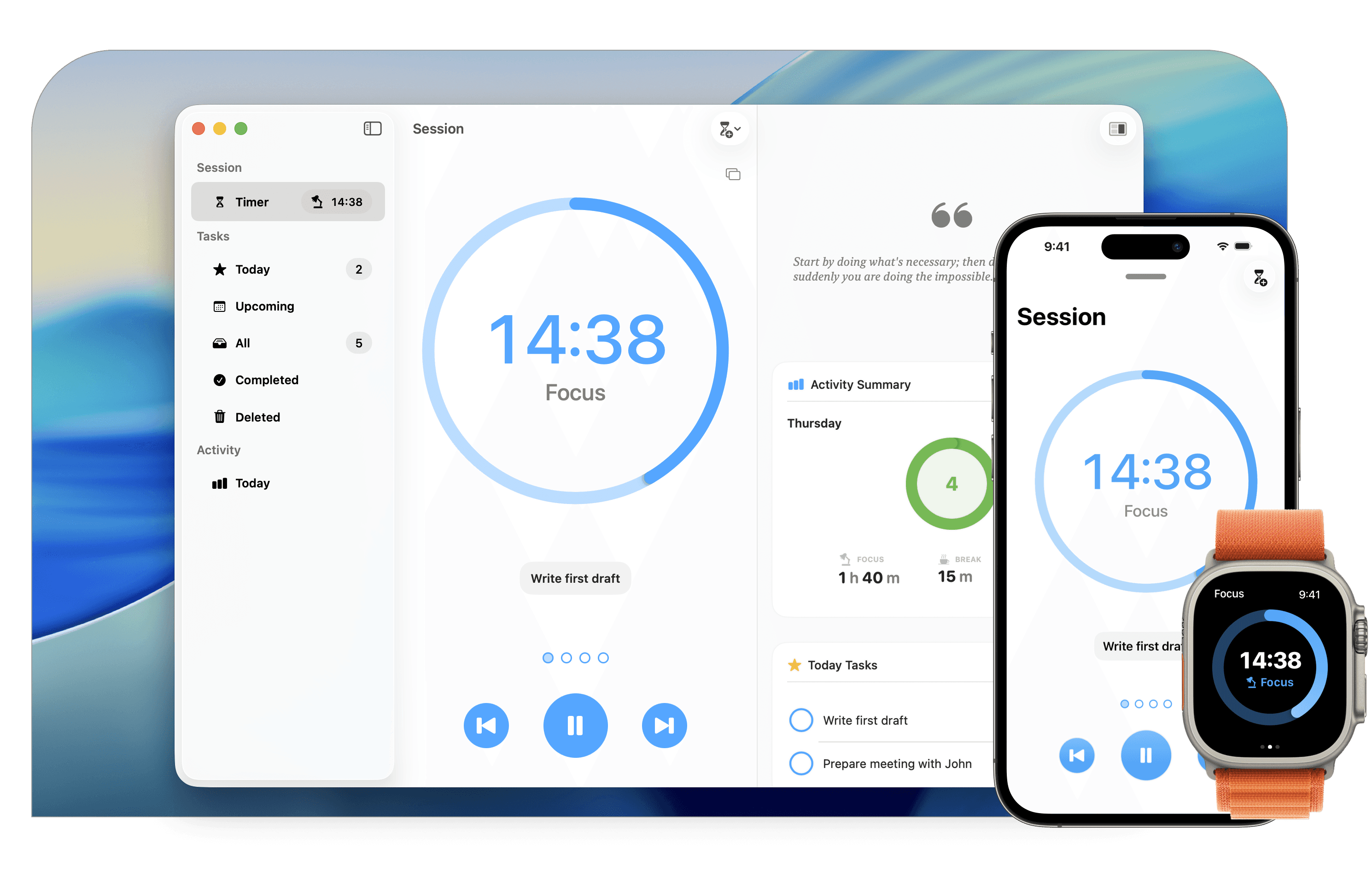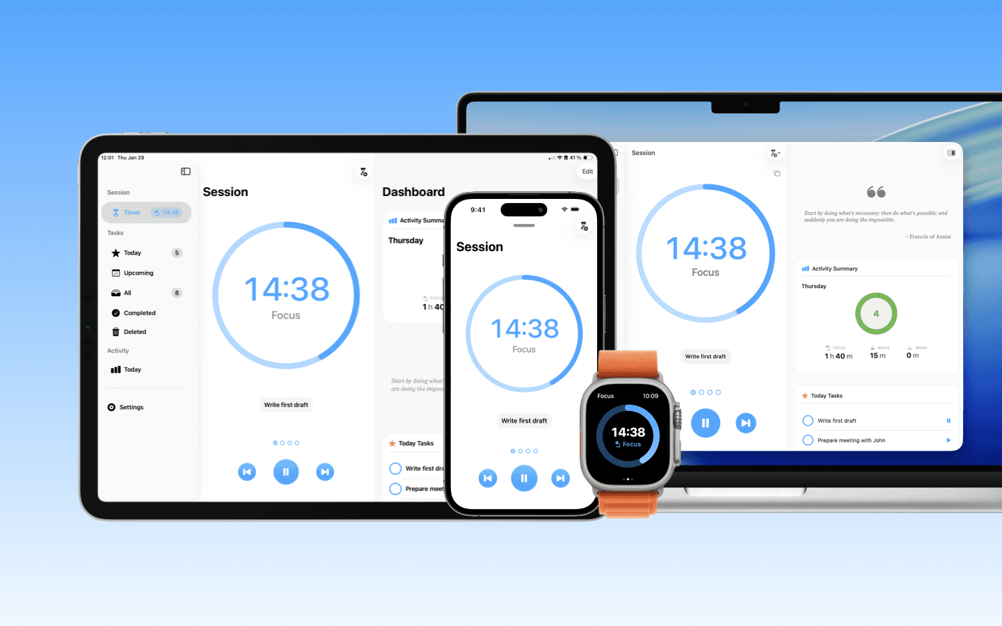 Your timer, tasks, and stats stay seamlessly in sync across all your devices, helping you maintain focus and get your work done – no matter which device you're using.